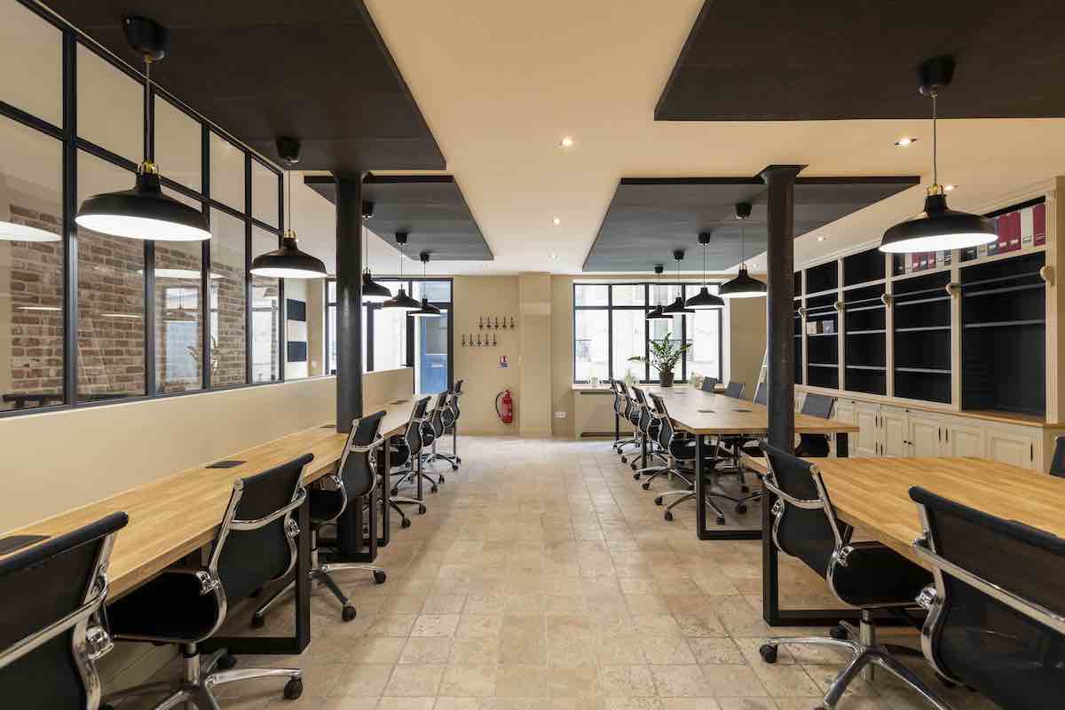 Ancien atelier d'artisan récemment restauré, cet espace de 150m2 sur deux niveaux dispose d'un vaste open space 18 postes baigné de lumière naturelle, de 3 salles de réunions (2, 3 et 6 pers.), d'un espace détente avec canapé et sièges,un coin cuisine avec micro-onde, évier, réfrigérateur, machine à café et bouilloire,une "cabine" pour passer des appels en toute confidentialité, de casiers à code.